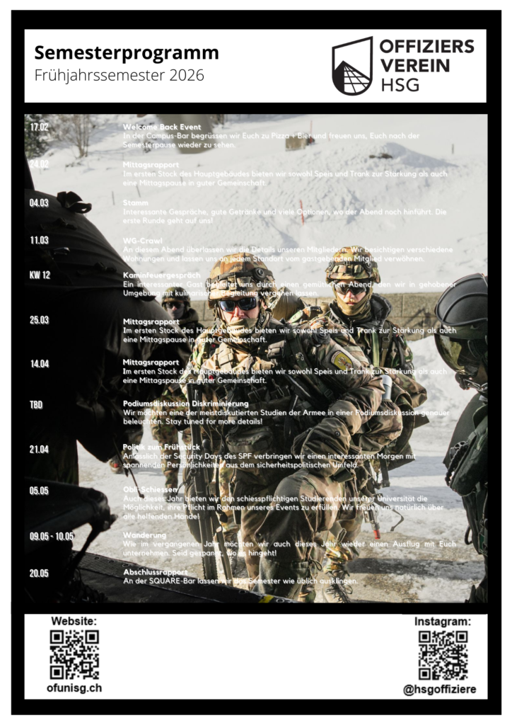Ein neues Vereinsjahr steht an! So auch wieder unser Herbstsemesterprogramm, gefüllt mit vielfältigen und spannenden Events. Für aktuelle Informationen schaut bei uns vorbei unter @hsgoffiziere auf Instagram oder in unserer Whatsapp-Gruppe.